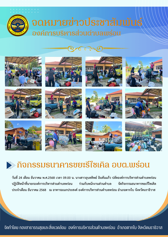 วันที่ 24 เดือน ธันวาคม พ.ศ.2568 เวลา 09.00 น. นางสาวอุบลทิพย์ อินทันแก้ว ปลัดองค์การบริหารส่วนตำบลพร่อน ปฏิบัติหน้าที่นายกองค์การบริหารส่วนตำบลพร่อน ร่วมกับพนักงานส่วนตำบล จัดกิจกรรมธนาคารขยะรีไซเคิล ประจำเดือน ธันวาคม 2568 ณ อาคารอเนกประสงค์ องค์การบริหารส่วนตำบลพร่อน อำเภอตากใบ จังหวัดนราธิวาส