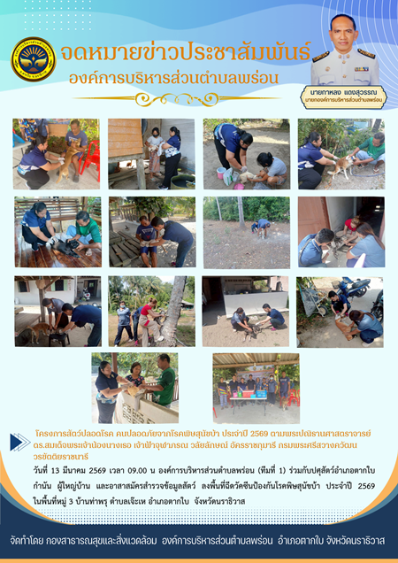 📆 วันที่ 13 มีนาคม 2569 เวลา 09.00 น องค์การบริหารส่วนตำบลพร่อน (ทีมที่ 1) ร่วมกับปศุสัตว์อำเภอตากใบ ผู้ใหญ่บ้าน และ อาสาสมัครสำรวจข้อมูลสัตว์ ลงพื้นที่ฉีดวัคซีนป้องกันโรคพิษสุนัขบ้า ประจำปี 2569 ในพื้นที่หมู่ 3 บ้านท่าพรุ ตำบลเจ๊ะเห อำเภอตากใบ จังหวัดนราธิวาส