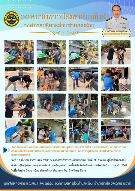 📆 วันที่ 13 มีนาคม 2569 เวลา 09.00 น องค์การบริหารส่วนตำบลพร่อน (ทีมที่ 2) ร่วมกับปศุสัตว์อำเภอตากใบ ผู้ใหญ่บ้าน และ อาสาสมัครสำรวจข้อมูลสัตว์ ลงพื้นที่ฉีดวัคซีนป้องกันโรคพิษสุนัขบ้า ประจำปี 2569 ในพื้นที่หมู่ 4 บ้านบางน้อย ตำบลเจ๊ะเห อำเภอตากใบ จังหวัดนราธิวาส