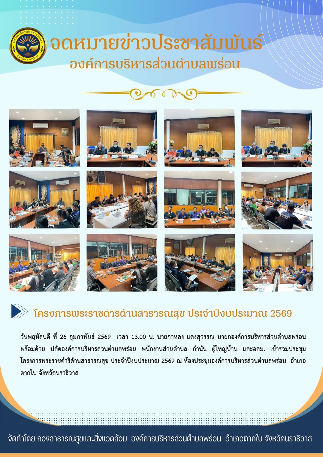 โครงการพระราชดำริด้านสาธารณสุข วันที่ 26 กุมภาพันธ์ 2569 เวลา 13.00 น. นายกาหลง แดงสุวรรณ นายกองค์การบริหารส่วนตำบลพร่อน พร้อมด้วย ปลัดองค์การบริหารส่วนตำบลพร่อน พนักงานส่วนตำบล กำนัน ผู้ใหญ่บ้าน และอสม. เข้าร่วมประชุมโครงการพระราชดำริด้านสาธารณสุข ณ ห้องประชุมองค์การบริหารส่วนตำบลพร่อน อำเภอตากใบ จังหวัดนราธิวาส