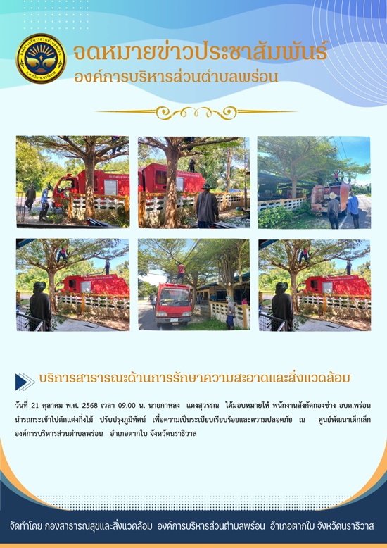 องค์การบริหารส่วนตำบลพร่อน อำเภอตากใบ จังหวัดนราธิวาสเผยแพร่เมื่อ: วันอังคาร, 21 ตุลาคม 2568 13:48 | เขียนโดย ไฟซอล มะมิงซี | พิมพ์ | ฮิต: 38 ที่ 21 ตุลาคม พ.ศ. 2568 เวลา 09.00 น. นายกาหลง แดงสุวรรณ ได้มอบหมายให้ พนักงานสังกัดกองช่าง อบต.พร่อน ดำเนินการตัดแต่งกิ่งไม้ ปรับปรุงภูมิทัศน์ เพื่อความเป็นระเบียบเรียบร้อยและความปลอดภัย ณ ศูนย์พัฒนาเด็กเล็ก องค์การบริหารส่วนตำบลพร่อน อำเภอตากใบ จังหวัดนราธิวาส ต่อไป