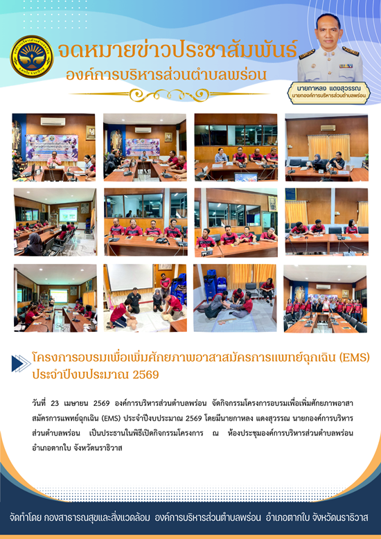 วันที่ 23 เมษายน 2569 องค์การบริหารส่วนตำบลพร่อน จัดกิจกรรมโครงการอบรมเพื่อเพิ่มศักยภาพอาสาสมัครการแพทย์ฉุกเฉิน (EMS) ประจำปีงบประมาณ 2569 โดยมีนายกาหลง แดงสุวรรณ นายกองค์การบริหารส่วนตำบลพร่อน เป็นประธานในพิธีเปิดกิจกรรมโครงการ ณ ห้องประชุมองค์การบริหารส่วนตำบลพร่อน อำเภอตากใบ จังหวัดนราธิวาส