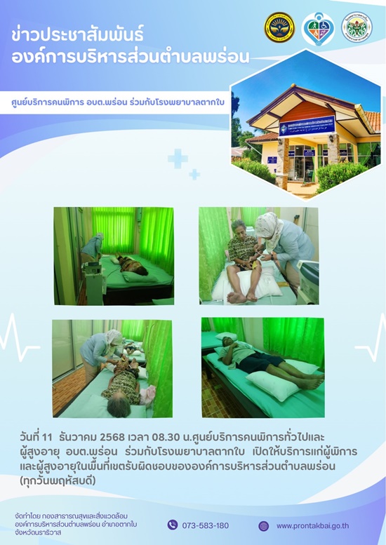 วันที่ 11 ธันวาคม 2568 เวลา 08.30 น.ศูนย์บริการคนพิการทั่วไปและผู้สูงอายุ อบต.พร่อน ร่วมกับโรงพยาบาลตากใบ เปิดให้บริการแก่ผู้พิการและผู้สูงอายุในพื้นที่เขตรับผิดชอบขององค์การบริหารส่วนตำบลพร่อน (ทุกวันพฤหัสบดี)