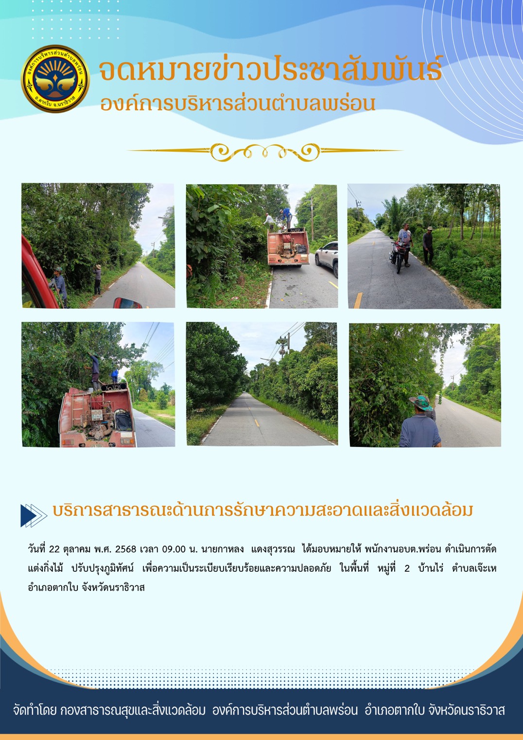 บริการสาธารณะด้านรักษาความสะอาดและสิ่งแวดล้อม ที่ 22 ตุลาคม พ.ศ. 2568 เวลา 09.00 น. นายกาหลง แดงสุวรรณ ได้มอบหมายให้ พนักงานอบต.พร่อน ดำเนินการตัดแต่งกิ่งไม้ ปรับปรุงภูมิทัศน์ เพื่อความเป็นระเบียบเรียบร้อยและความปลอดภัย ในพื้นที่ หมู่ที่ 2 บ้านไร่ ตำบลเจ๊ะเห อำเภอตากใบ จังหวัดนราธิวาส