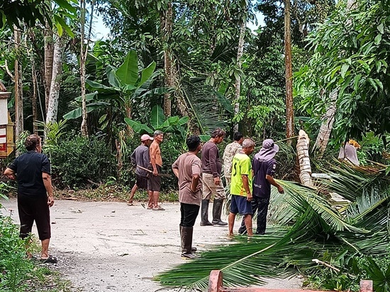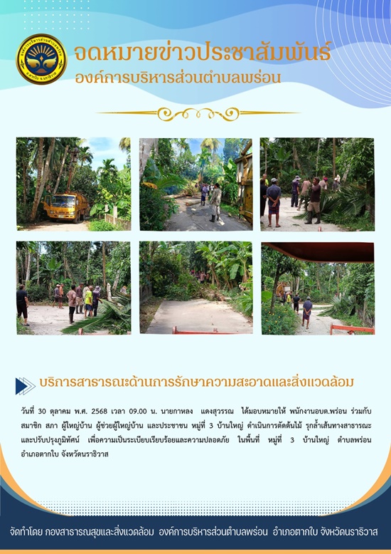 บริการสาธารณะด้านรักษาความสะอาดและสิ่งแวดล้อม วันที่ 30 ตุลาคม พ.ศ. 2568 เวลา 09.00 น. นายกาหลง แดงสุวรรณ ได้มอบหมายให้ พนักงานอบต.พร่อน ร่วมกับ สมาชิก สภา ผู้ใหญ่บ้าน ผู้ช่วยผู้ใหญ่บ้าน และประชาชน หมู่ที่ 3 บ้านใหญ่ ดำเนินการตัดต้นไม้ รุกล้ำเส้นทางสาธารณะ และปรับปรุงภูมิทัศน์ เพื่อความเป็นระเบียบเรียบร้อยและความปลอดภัย ในพื้นที่ หมู่ที่ 3 บ้านใหญ่ ตำบลพร่อน อำเภอตากใบ จังหวัดนราธิวาส