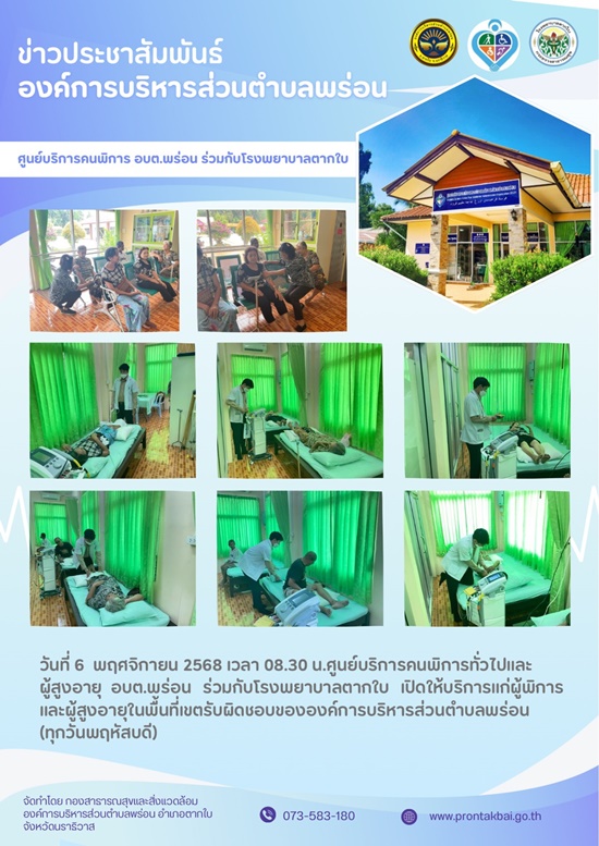 วันที่ 6 พฤศจิกายน 2568 เวลา 08.30 น.ศูนย์บริการคนพิการทั่วไปและผู้สูงอายุ อบต.พร่อน ร่วมกับโรงพยาบาลตากใบ เปิดให้บริการแก่ผู้พิการและผู้สูงอายุในพื้นที่เขตรับผิดชอบขององค์การบริหารส่วนตำบลพร่อน (ทุกวันพฤหัสบดี)