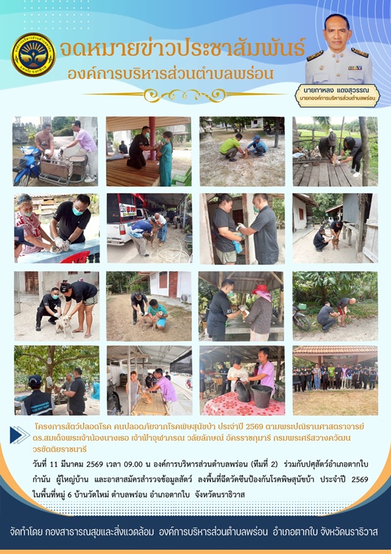 📆 วันที่ 11 มีนาคม 2569 เวลา 09.00 น องค์การบริหารส่วนตำบลพร่อน (ทีมที่ 2) ร่วมกับปศุสัตว์อำเภอตากใบ ผู้ใหญ่บ้าน และ อาสาสมัครสำรวจข้อมูลสัตว์ ลงพื้นที่ฉีดวัคซีนป้องกันโรคพิษสุนัขบ้า ประจำปี 2569 ในพื้นที่หมู่ 6 บ้านวัดใหม่ ตำบลพร่อน อำเภอตากใบ จังหวัดนราธิวาส