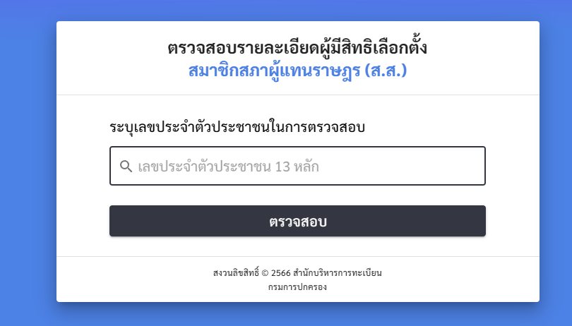 - ตรวจสอบรายละเอียดผู้มีสิทธิเลือกตั้งสมาชิกสภาผู้แทนราษฎร(ส.ส.)