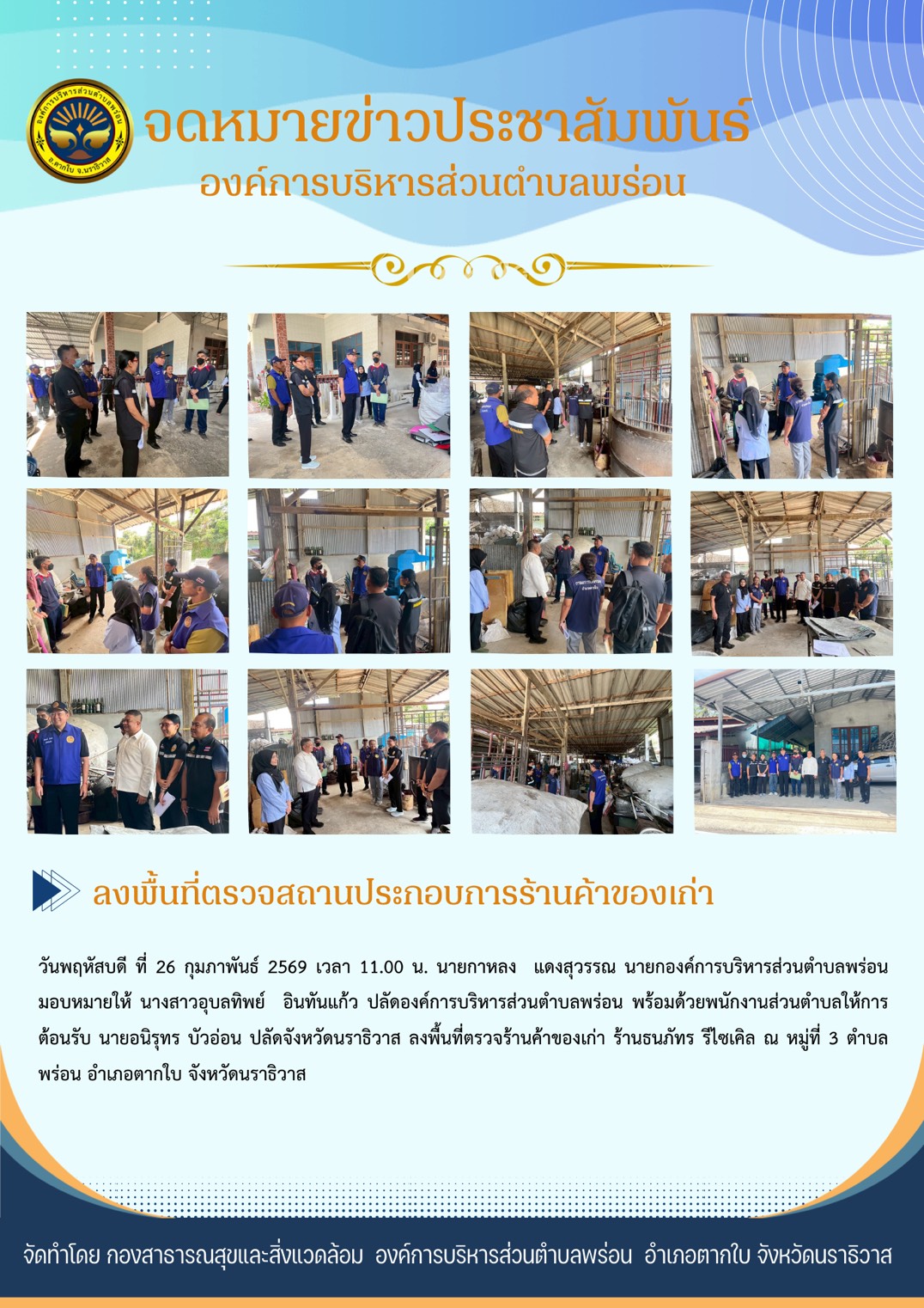 วันพฤหัสบดีที่ 26 กุมภาพันธ์ 2569 เวลา 11.00 น. นายกาหลง แดงสุวรรณ นายกองค์การบริหารส่วนตำบลพร่อน มอบหมายให้ นางสาวอุบลทิพย์ อินทันแก้ว ปลัดองค์การบริหารส่วนตำบลพร่อน พร้อมด้วยพนักงานส่วนตำบลให้การต้อนรับ นายอนิรุทร บัวอ่อน ปลัดจังหวัดนราธิวาส ลงพื้นที่ตรวจร้านค้าของเก่า ร้านธนภัทร รีไซเคิล ณ หมู่ที่ 3 ตำบลพร่อน อำเภอตากใบ จังหวัดนราธิวาส